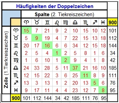 Die am rechten und unteren Rand aufgelisteten Werte entsprechen der Verteilung unter Punkt b). Die Summe der Randwerte beträgt 900, was der Gesamtanzahl der Tierkreiszeichen im Text entspricht.