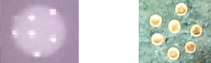 Die fliegende Untertasse entpuppt sich als eine Art blaß-violetter Lichtschein. Im Innern befindet sich ein grauer Kreis mit sieben weißen Punkten. Dieser Kreis folgt in den nächsten Vergrößerung (Abb. 3a).