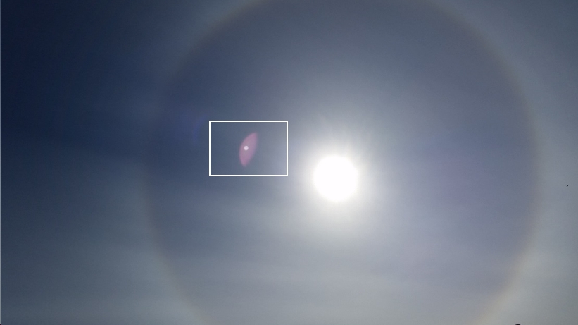 Am Morgen des 31. Mai 2020 wurde die folgende Aufnahme in der Nähe von Heilbronn in Richtung Osten gemacht: Die Sonne (hell, weiß, diffus) in der Mitte des Bildes erzeugt eine Halo in der Atmosphäre (In Abb.1 zu erkennen am Übergang von dunkel zu hell des großen Kreises im Abstand von ca. 3,7 Sonnendurchmessern, der bis über den oberen bzw. unteren Rand des Bildes reicht). Und auf nicht ganz halber Strecke zwischen Sonne und Halorand befindet sich eine blaß-violette Struktur mit einem weißen Punkt darin (Abb. 1, im weißen Rechteck).